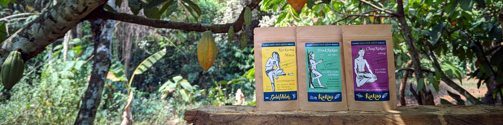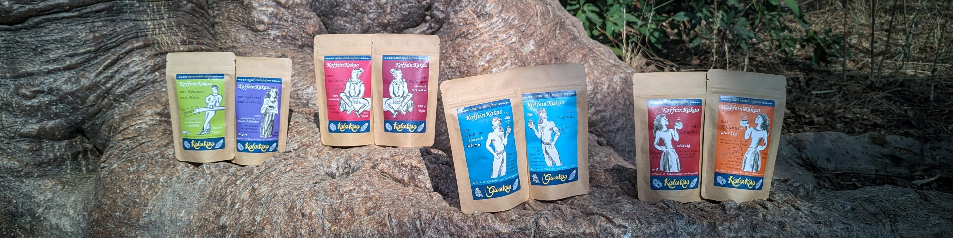 Unseren Kakao mit Koffein, als KolaKao (KolanussKakao) oder GuaKao (GuaranaKakao), gibt es in verschiedenen Rezepturen. Er ist ein sanfter, aber auch lang anhaltender Koffeinlieferant mit Kolanuss (Colanuss), Guarana, Kakao, Maca und edlen Gewürzen. Je nach Vorliebe gibt es unseren Kakao gesüßt und ungesüßt (ohne Zuckerzugabe). KolaKao ist ein rein natürliches und veganes Produkt der sächsischen Manufaktur natur-reich-inform.
