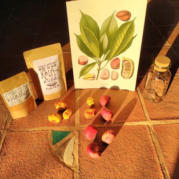 Zubereitung Kolanuss kann für die Zubereitung von Getränken oder zum backen verwendet werden.Kolanusspulver möglichst mit weiteren Zutaten (Zucker, Kakao, Maca ...) zuerst trocken mischen. Dann diese Mischung erst mit Flüssigkeit (heiß oder kalt) mixen oder im Teig verarbeiten.Wer gut ist, produziert seine eigenen Energieriegel damit ;-).Verzehrsempehlung / Dosierung: Ein gestrichener Teelöffel (4g) entspricht einer Portion. Der Koffeingehalt entspricht dann ca. einer Tasse Kaffee.Kolanusspulver in Fruchtshake, Saft, Kakao, Milch oder Pflanzendrink einrühren. Idealerweise zuerst mit etwas Flüssigkeit cremig rühren oder mit einem Schneebesen einquirlen.Das kolanusspulver verält sich wie Kakaopulver und kann auch genauso verwendet werden, wenn mann zwei Dinge beachtet:1.: den Koffeingehalt, das wirkt auch nach dem Backen noch!2.: Kolanuss hat so gut wie kein Fettgehalt, Kakaopulver hingegen meißt 10 bis 12%, bzw. noch mehr, je nach Qualität.
