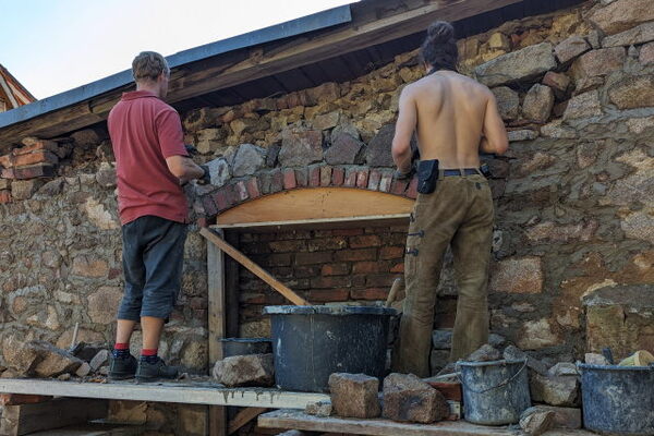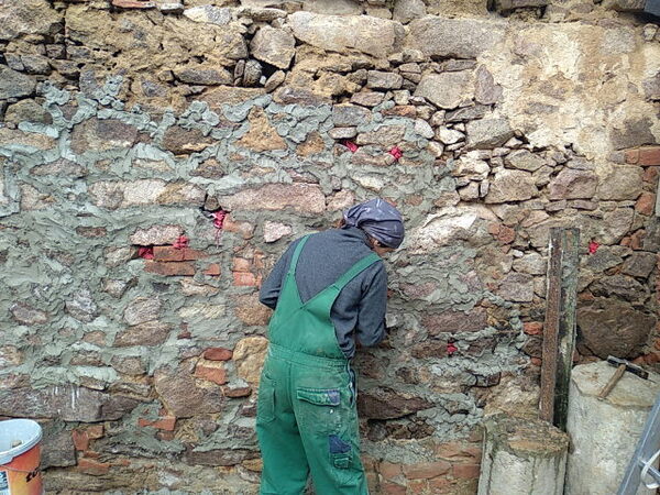 Das weitläufige Gelände umfasst viel erhaltungswürdige Bausubstanz, in verschiedenen "Verfallsstadien". Hier wird ein Rundbogen in einer alten Bruchsteinwand mittels Schalung neu gesetzt und die Mauer darüber mit Bruchsteinen aufgemauert.
