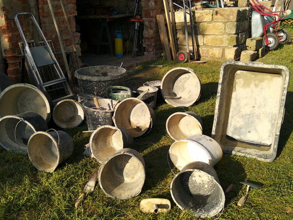 Baustelle aus. Hier trocknen die Maurerutensilien in der Abendsonne nach