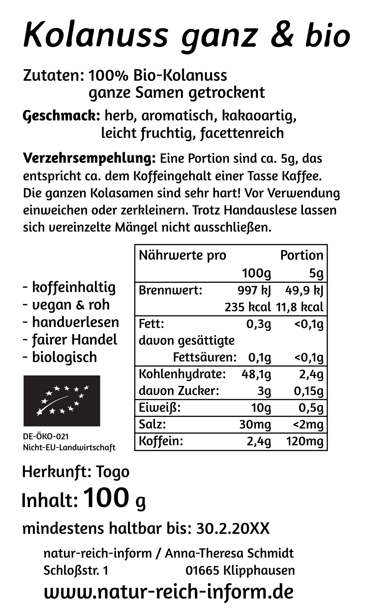 - Wer kein Wert auf das Bio-Siegel legt ist mit unserer klassischen Kolanuss genauso gut beraten: siehe "Ähnliche Artikel" unten.